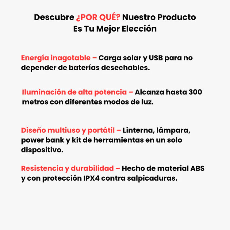 Con POWERLUX™ 3 en 1, olvídate de baterías desechables y herramientas dispersas. Su luz LED de alto rendimiento y carga solar garantizan energía en todo momento. ¡La solución completa para tu seguridad y tranquilidad!