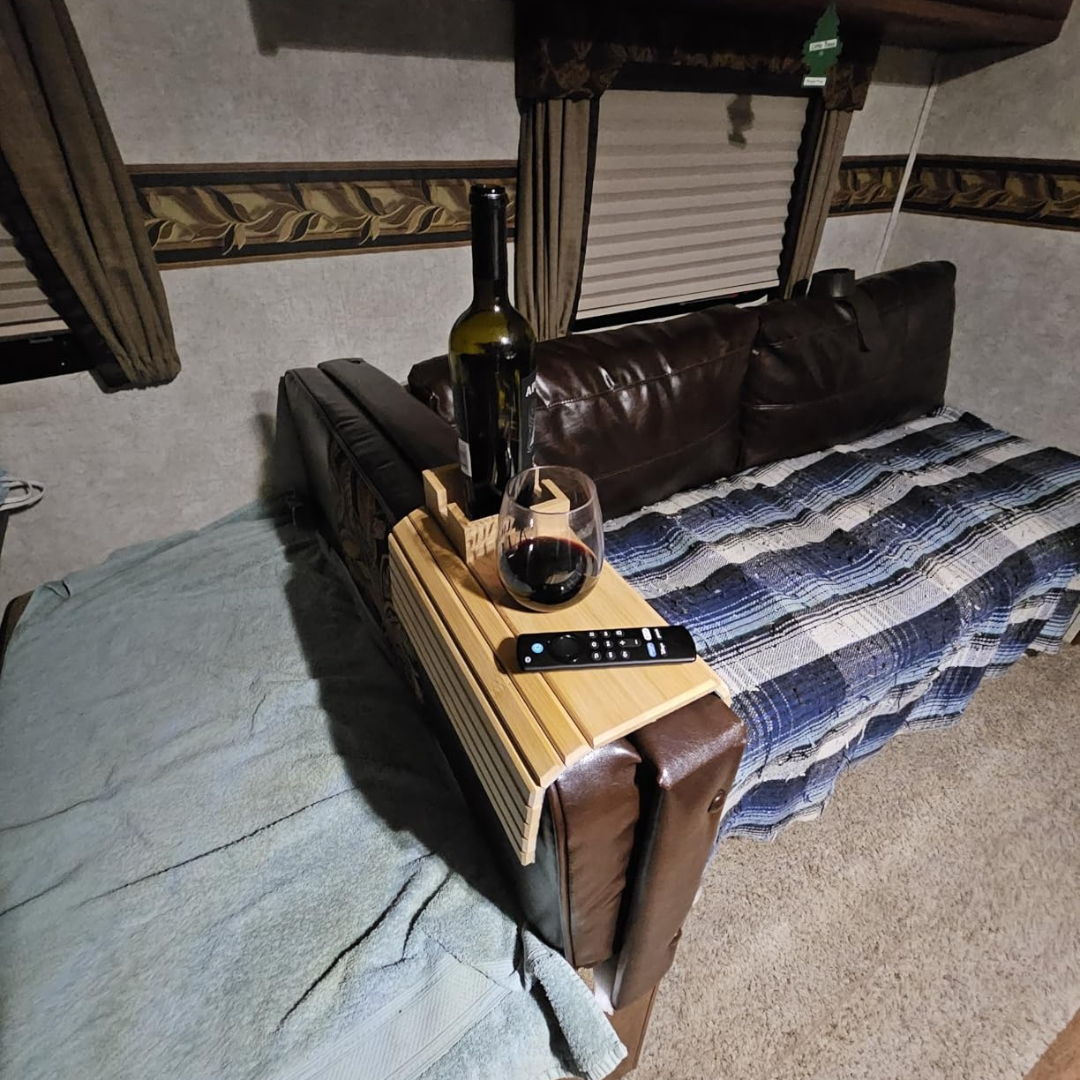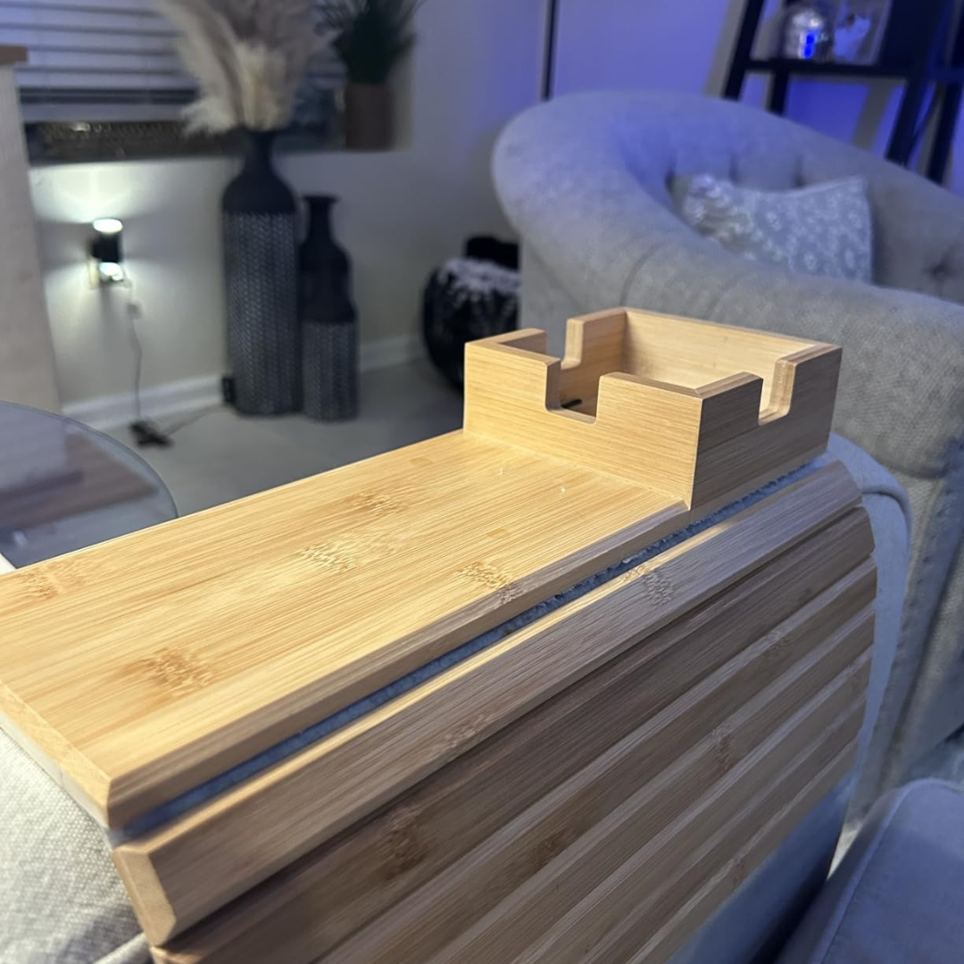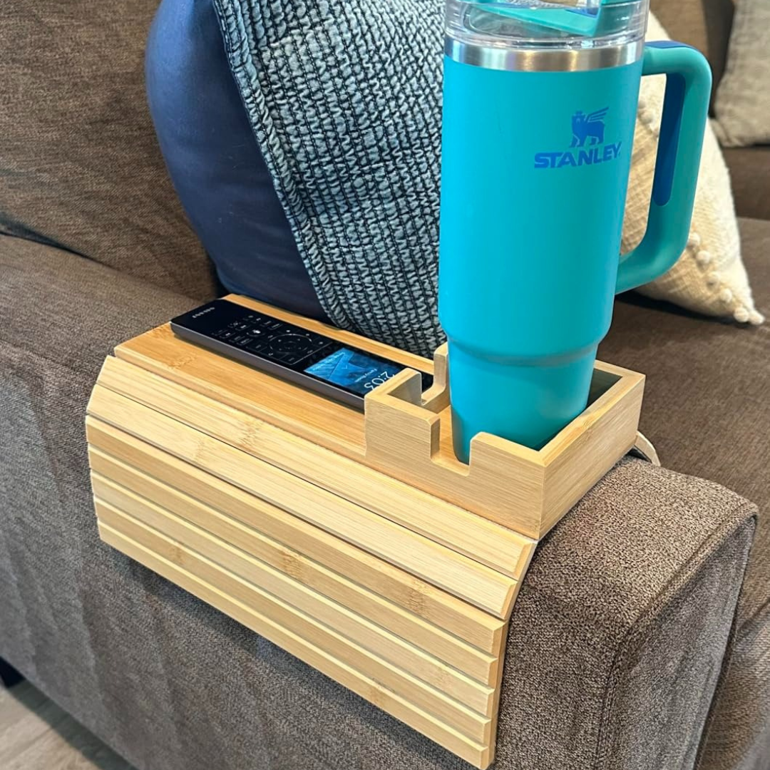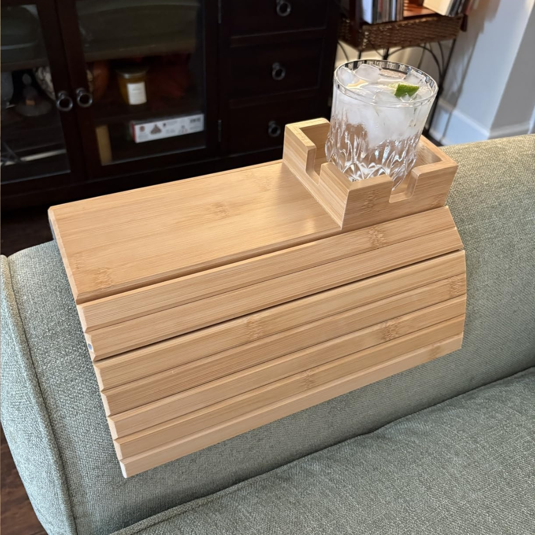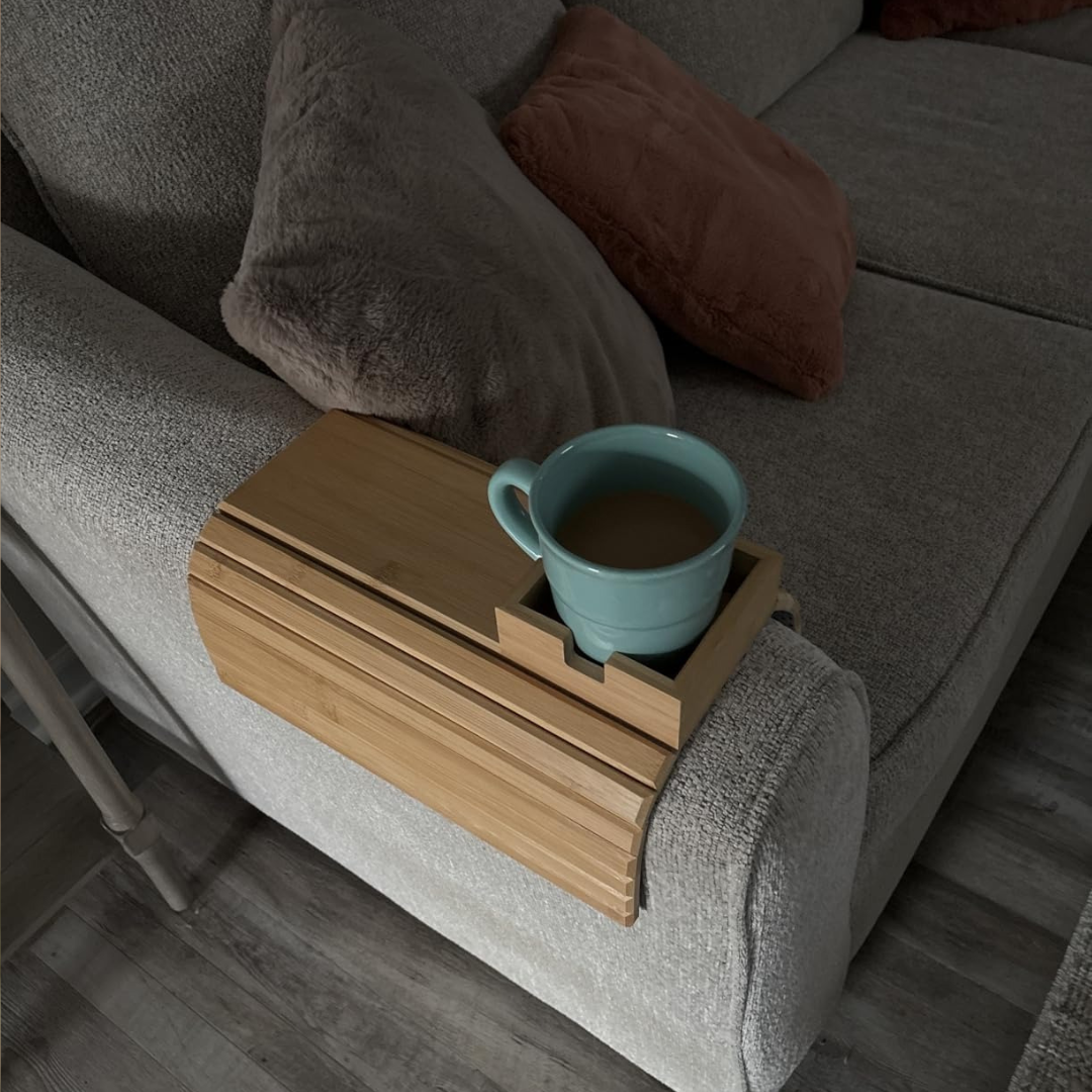 BAMSOFA™ se ajusta a cualquier reposabrazos y te da un espacio firme para tu café, snacks o celular. Hecha de bambú natural, luce elegante, resistente y fácil de limpiar.