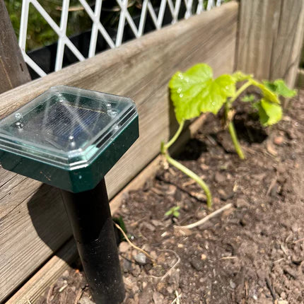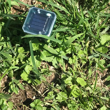 Inserta la estaca del dispositivo en el suelo firmemente. No necesitas cables ni instalaciones complicadas, solo presiónalo hasta que quede fijo.