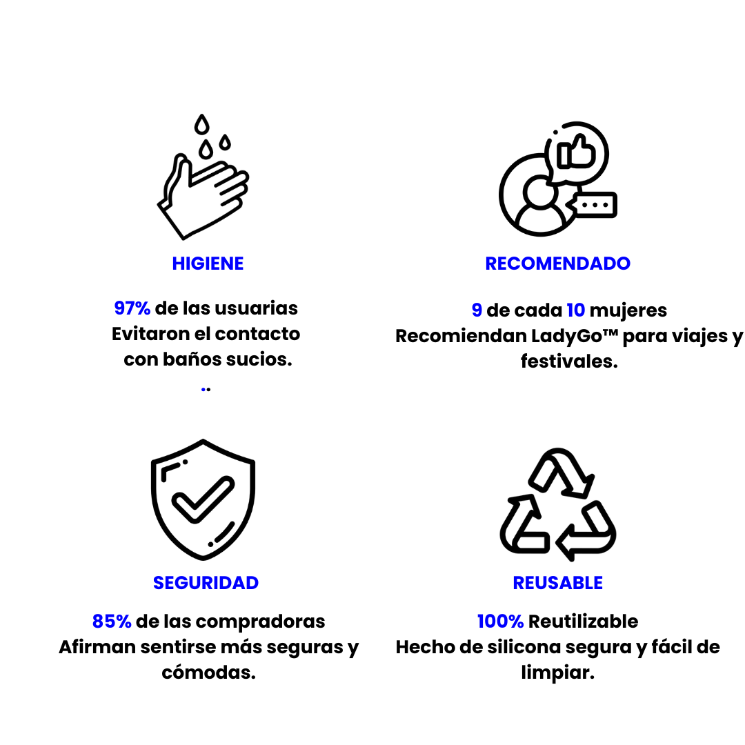 Si valoras la libertad, la higiene y la seguridad, LadyGo™ es para ti. Únete a miles de mujeres que ya dejaron atrás los baños sucios y disfrutan de una solución cómoda en cualquier lugar. Perfecto para viajes, festivales, embarazadas y aventureras.